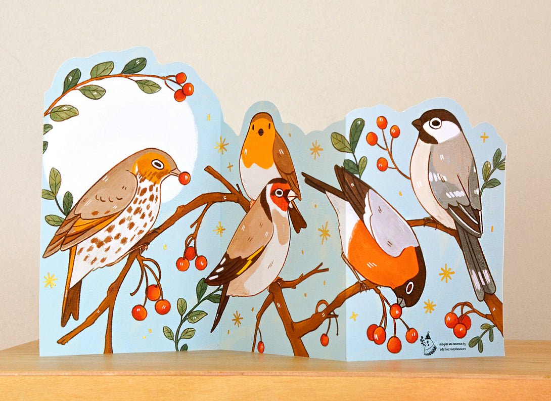 An accordion postcard featuring various Winter birds! It has a blank space at the back to write messages ♥