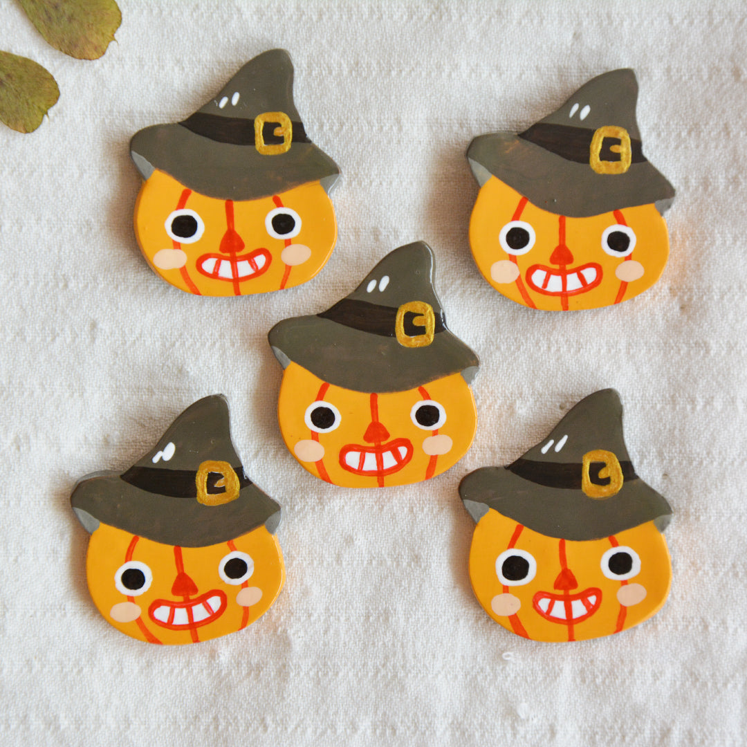 A pumpkin friend with a witch hat to make your outfits extra magical!